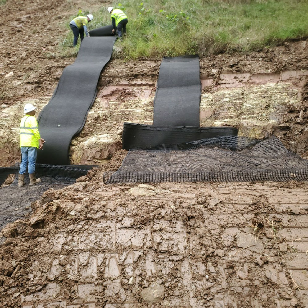 The Evans Slip Repair required extra attention and precautions as we worked around an active inground pipeline. We then customized a drain installation and trench breaker to ensure proper soil stabilization, which included the installation of geogrid.